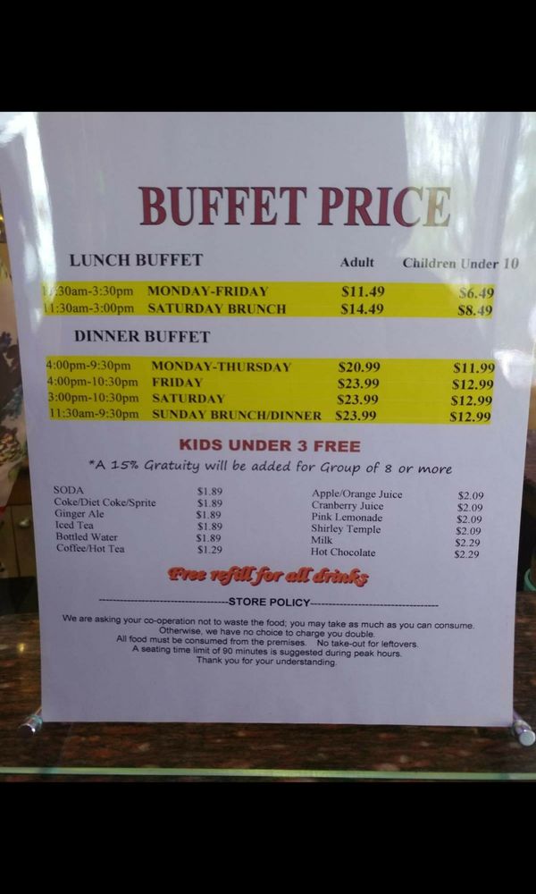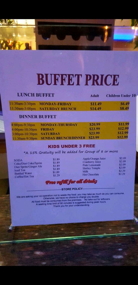 “ Came here a couple months ago and have returned once since. By buffet standards they are a grade above most others. While it is also a little more expensive, the dinner buffet has a lot of nice offerings. The ice cream actually tastes like ice cream instead of water that you get at many other buffets. The staff is not friendly and they are like hawks watching. I've seen them take plates, drop the check and cookies while people are still eating. With that being said they still get the 4. Keep in mind it is a 4 for buffets!!! The standards change depending on the type of establishment. I would certainly return. And you should give them a shot if you haven't yet. ENJOY!!! ”